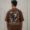 An oversized brown tee featuring a majestic, detailed graphic of the Bald Eagle wrapped in American flag banners and the text “America LAND OF THE FREE.”