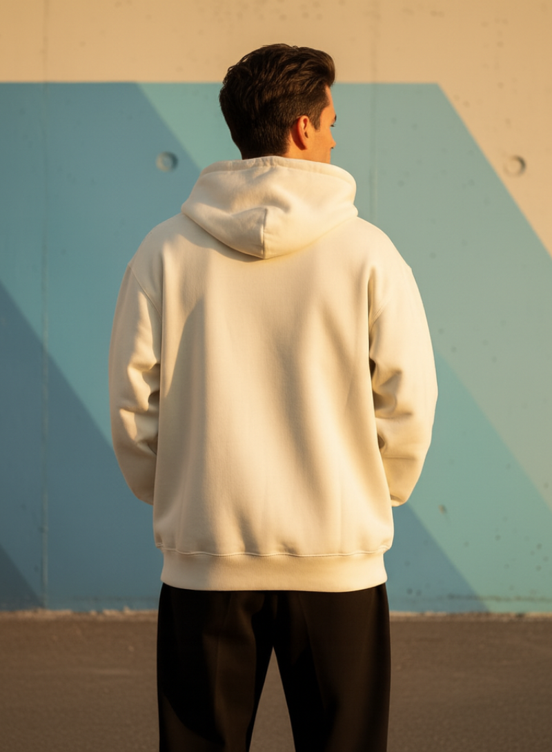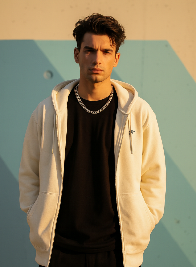 This outfit captures effortless urban style, featuring a beige zipper hoodie layered over a clean black t-shirt. It is grounded by wide-leg, light-wash denim, embracing the current trend towards relaxed silhouettes. The pairing is completed with  maintaining a clean aesthetic contrast. This look balances classic comfort with modern street-wear proportions, suitable for everyday wear.