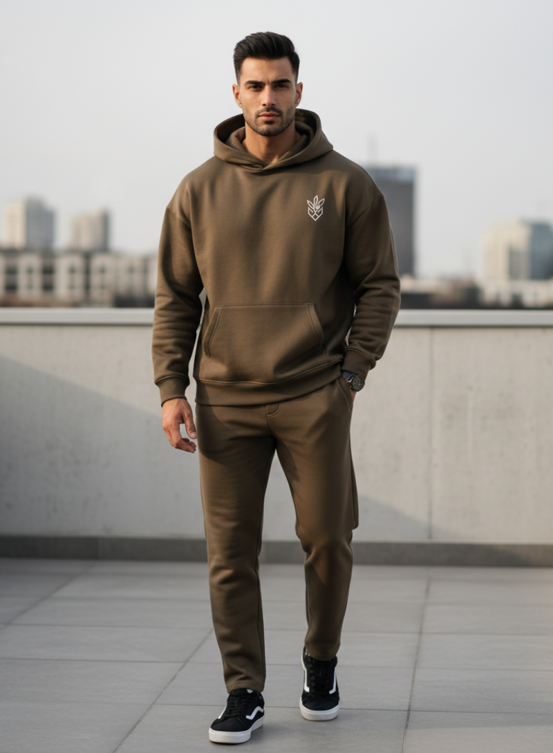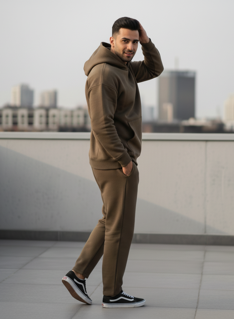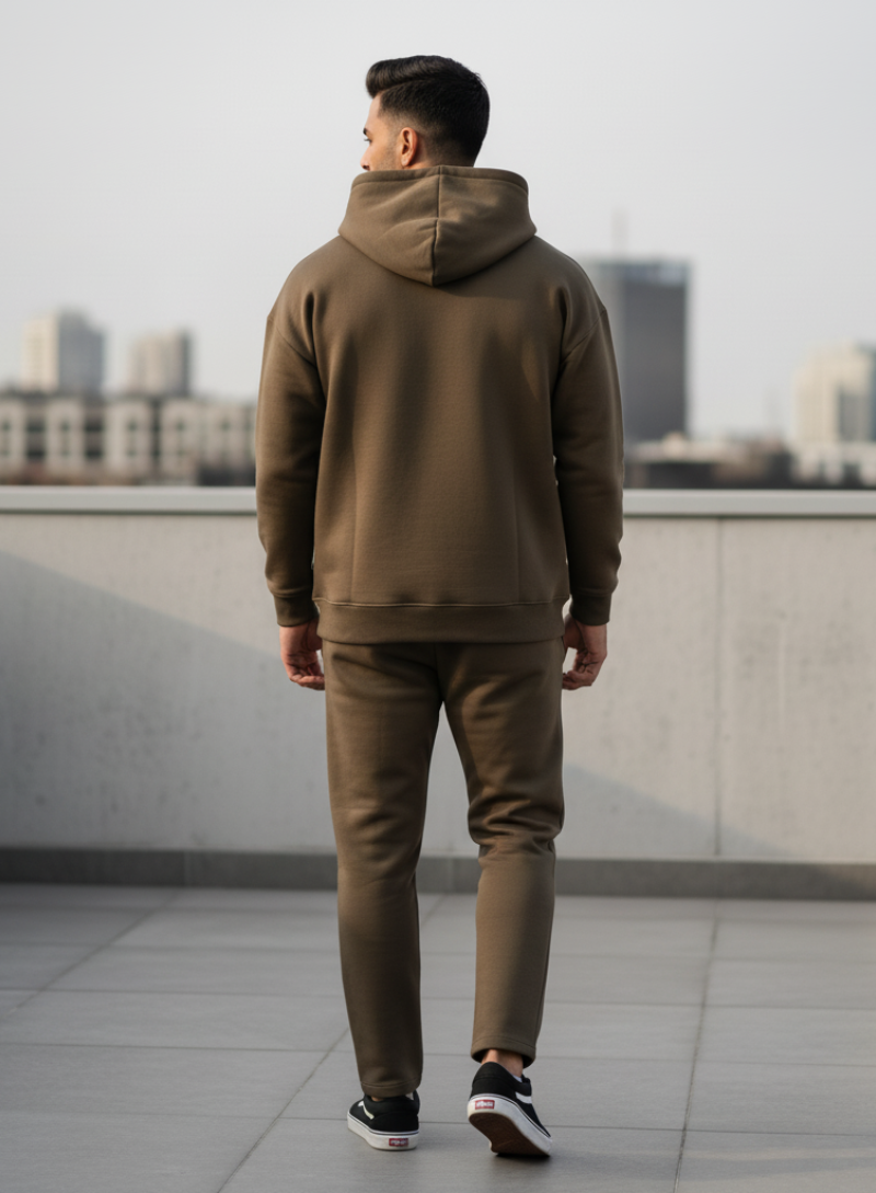 A luxurious, oversized mouse brown fleece coord set designed for premium comfort and a rich, confident streetwear look, featuring a dropped-shoulder hoodie and tailored fleece joggers.