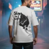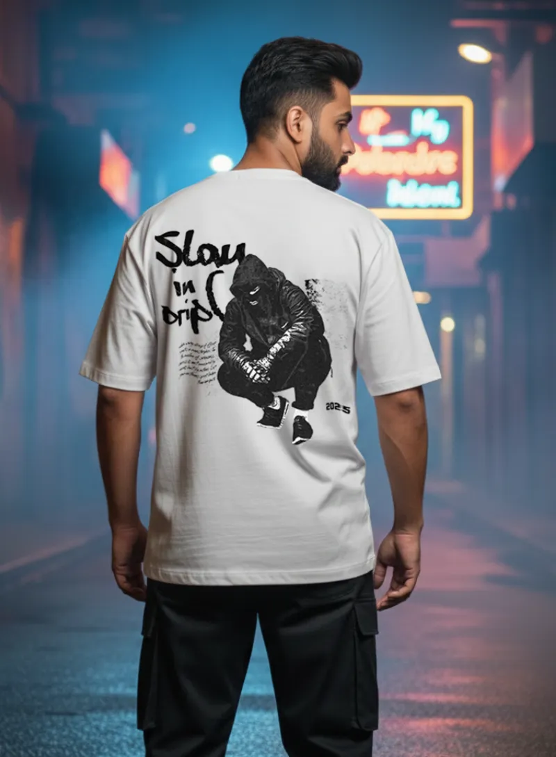 Oversized white t-shirt featuring a high-contrast graphic of a masked, crouching figure paired with the bold, handwritten-style text “Slay in Drip.”